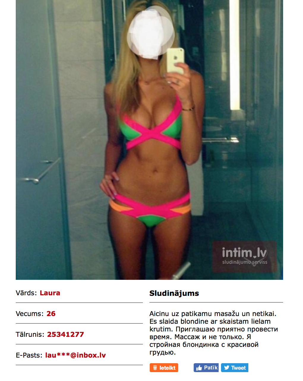 Tātad intim.lv sludinās Laura - 25341277. Neko forumā neatradu, varbūt dikti dziļi ir jārok. Lai vai kā, atrodas brīvības iela 133. Uzzvanu, masāzā 50, sex 100. Ok, būšu drīz klāt. Saka, nē, lai esmu pēc 30 min. Ok.