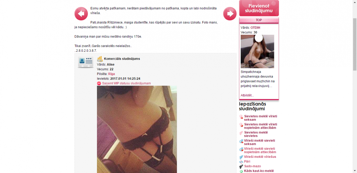 Čau, lieliskais vīrieti ! Ir klāt ziemīgā nedēļas nogale un es esmu ļoti izsalkusi pēc vīrišķīgiem pieskārieniem un kaisles. Atbrauc ciemos pie manis un kopā piepildīsim laiku gan ar sarunām, gan neķītrākām izdarībām. Garlaicīgi nebūs ! Atrodos Rīgā, un nepacietīgi gaidu Tavu zvanu - 24911096 Bučas