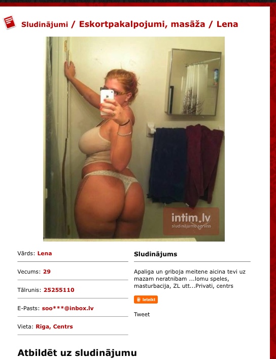 Robis99 2 Ierakstīts 2018. gada 27. augusts Lena 25255110 Ierakstīts 2018. gada 27. augusts Intim.lv sludinajums.Kādas atsauksmes ? Ir kāds bijis ? Link to post