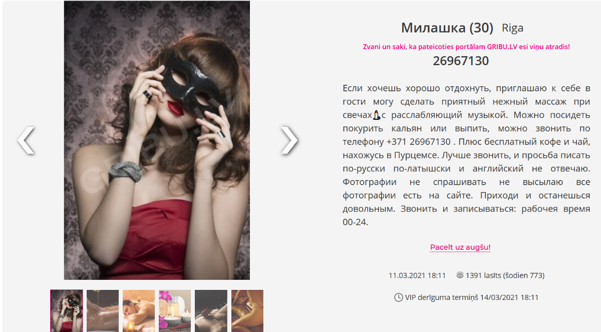 "Если хочешь хорошо отдохнуть, приглашаю к себе в гости могу сделать приятный нежный массаж при свечах🕯️с расслабляющий музыкой. Можно посидеть покурить кальян или выпить, можно звонить по телефону +371 26967130 . Плюс бесплатный кофе и чай, нахожусь в Пурцемсе. Лучше звонить, и просьба писать по-русски по-латышски и английский не отвечаю. Фотографии не спрашивать не высылаю все фотографии есть на сайте. Приходи и останешься довольным. Звонить и записываться: рабочея время 00-24."