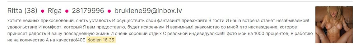 Atskats uz apmeklējumu: Cenas, atrašanās vieta - tas pats, kas pirmajā postā (divi zili/četri zili). Gadi 40-45, augums labs, vairāk vai mazāk atbilst bildēm, seja nedaudz pavelk atzīmi uz leju, bet nav jau arī 20 gadīga meitene Laipna, saskarsmē patīkama, pēc dušas piedāvāja tēju/kafiju, nedaudz parunājām un ķērāmies pie galvenā. Minets labs, bet ir bijis labāks. Seksā diezgan aktīva, iekarsa, bija manāms, ka pašai viss patīk