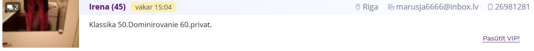 Sarakstījās arī whatsapp. Takse bija pieci.nulle eur un seši.nulle, ja gribētu bdsm. Foto atbilst daļēji. Vizuāli BBW GILF tipa sieviete, viduklis ar krunkām un krokām, krūtis patīkamas. Attieksme draudzīga un pieklājīga, saprot nedaudz arī latviski. Vieta bija Dārzciemā, netālu no Zeltiņu ielas un Vestienas ielas krustojuma. Telpas ar visām minimālām ērtībām. Pirms dušas naudu atstāju telpā, pēc dušas uz gultas. Sākumā vienkārša muguras berzes masāža. Pēc tam nedaudz mutiskais. Tālāk pamīšus misionārs un no aizmugures, kamēr mudināja beigt. Procesā atkailināja krūtis un novilka biksītes, bet atstāja melno tērpu, stenēja vairāk monotoni un samāksloti. No ierašanās līdz prom došanās brīdim sanāca apm. 35min.