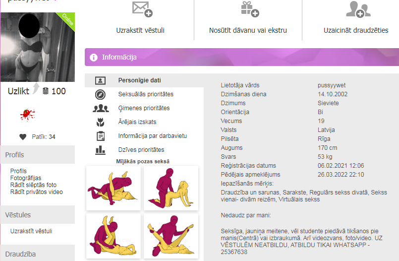 Jā, es prasu bildi, vai video zvanu. Es gribu zināt, kā izskatās cilvēks ar kuru grasos tikties. Negribu tērēt, ne savu, ne cita cilvēka laiku. Stulbi būtu, ja ierastos numuriņā un man tas cilvēks nepatiktu un es vienkārši aizbrauktu prom.