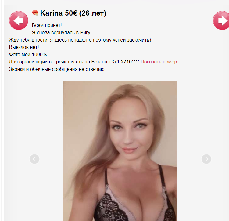 Полное кидалово. Приехал по адресу и простоял на улице 40 минут на холоде. Когда я начал спрашивать где она и стоит ли её ждать - перестала отвечать но была онлайн. В итоге тотальный развод и плохое настроение. Её номер 27101166