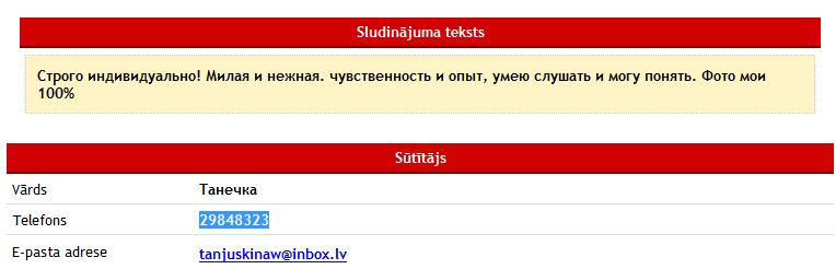 Ivars997 0 Ierakstīts 2012. gada 25. janvāris Tanechka 29848323 Ierakstīts 2012. gada 25. janvāris Ludzu kolegi padalamies pieredze? It ka esot Ganibu dambis 15, blacklist, bet baigi uzsver ka taa ir vina, biju sazvanijis un vina sevi aprakstija precizi kaa bilde. Jusu domas? http://www.intim.lv/...XwyfDI2MDgzOA== Link to post