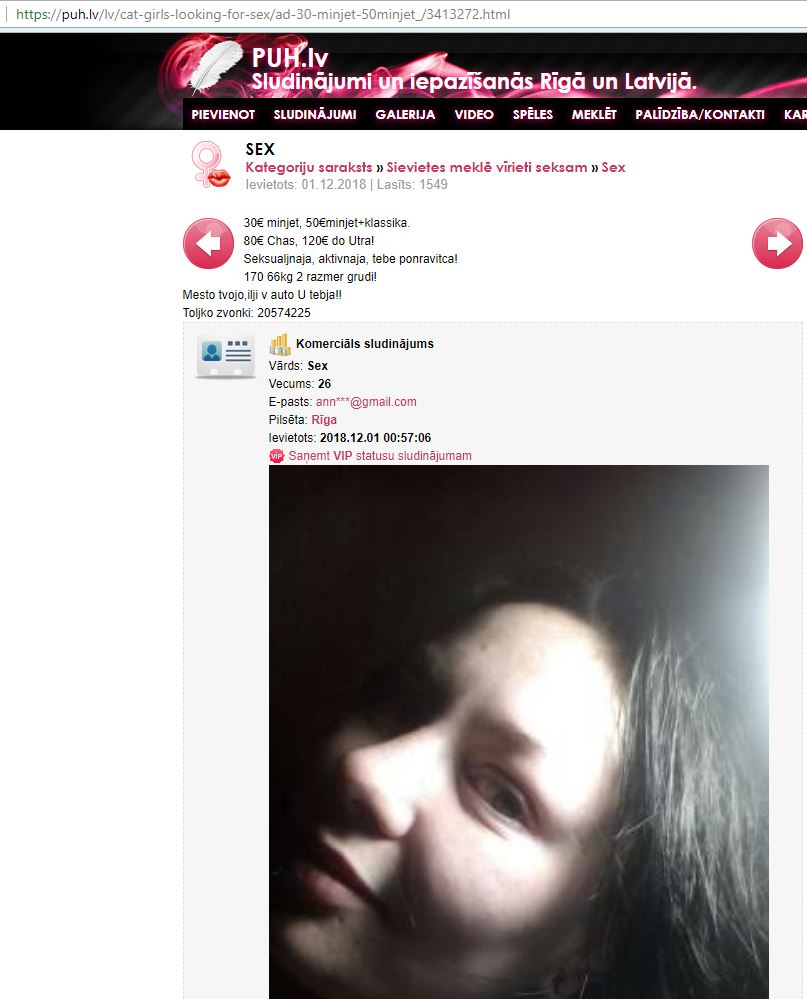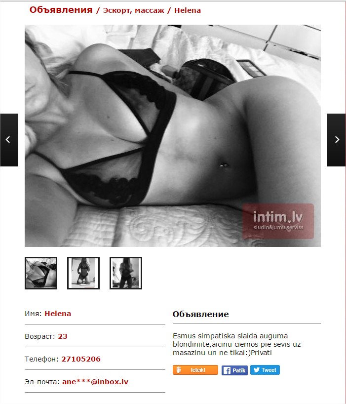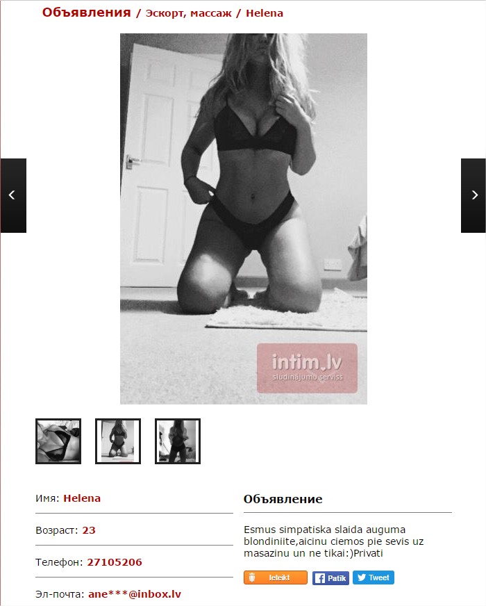 Принимает в Кенгарагсе (Маскавас 279). Девушка худее чем на фотке, фигура скелетного типа (-). Вся довольно дряблая. Девушка рожала, поэтому на особое сопротивление при входе в неё рассчитывать не стоит. Отношение хорошее, довольно милая и приветливая.