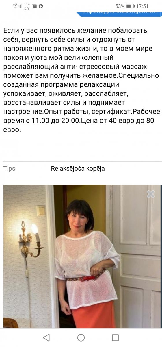 Ir būts pie viņas uz masāžu, pilnīgs murgs, sasteigts proces, telpas toreiz nekādas, aukstas , norāva dūrē bez jebkādām emocijām, vari patestēt ja tevī ir mozohisma gēns😁