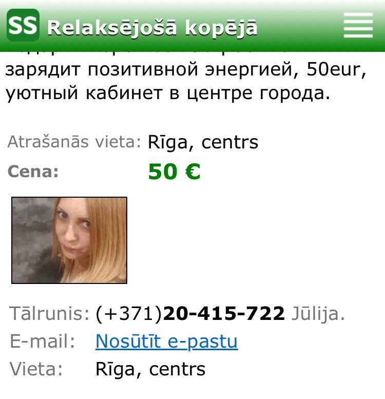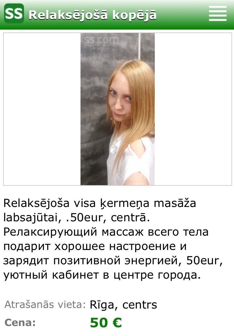 ieinteresēja pēc paskata un go4sex saitā atradu šito un uzrakstīju. rakstīja, ka masē kaila, zeķēs un var glāstīt ķermeni (nesapas ar atsauksmēm), kas likās aizdomīgi jau. par apmeklējumu grib septiņus desmitus. pajautāju šai, vai ir iespējami mutiskie darbi un te pēc atbildes gandrīz pakritu no ķebļa. ka viņa nevienam nepiedāvā sūkāt, esam pilnīgi sveši un viņa neesot mauka klasiskajā izpratnē.