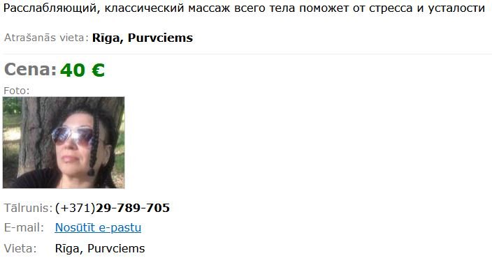 Takse bija četri.o eur. Foto un apraksti atbilst. Vizuāli MILF tipa sieviete, miesa ar nojaušamām krunkām un krokām, krūtis lielas, bet kailu neredzēju. Attieksme pieklājīga. Vieta Purvciemā netālu no Zvaigznājas gatve un Ģertrūdes ielas krustojuma. Telpas ar visām minimālām ērtībām. Pirms dušas naudu atstāju telpā, pēc dušas uz kušetes. Tālāk vidēji stipra masāža mugurai, kājām un rīkam. Procesā fonā tipiskā nomierinošā mūzika, pati bez īpašas izteiksmes. No ierašanās līdz prom došanās brīdim sanāca apm. 50min.