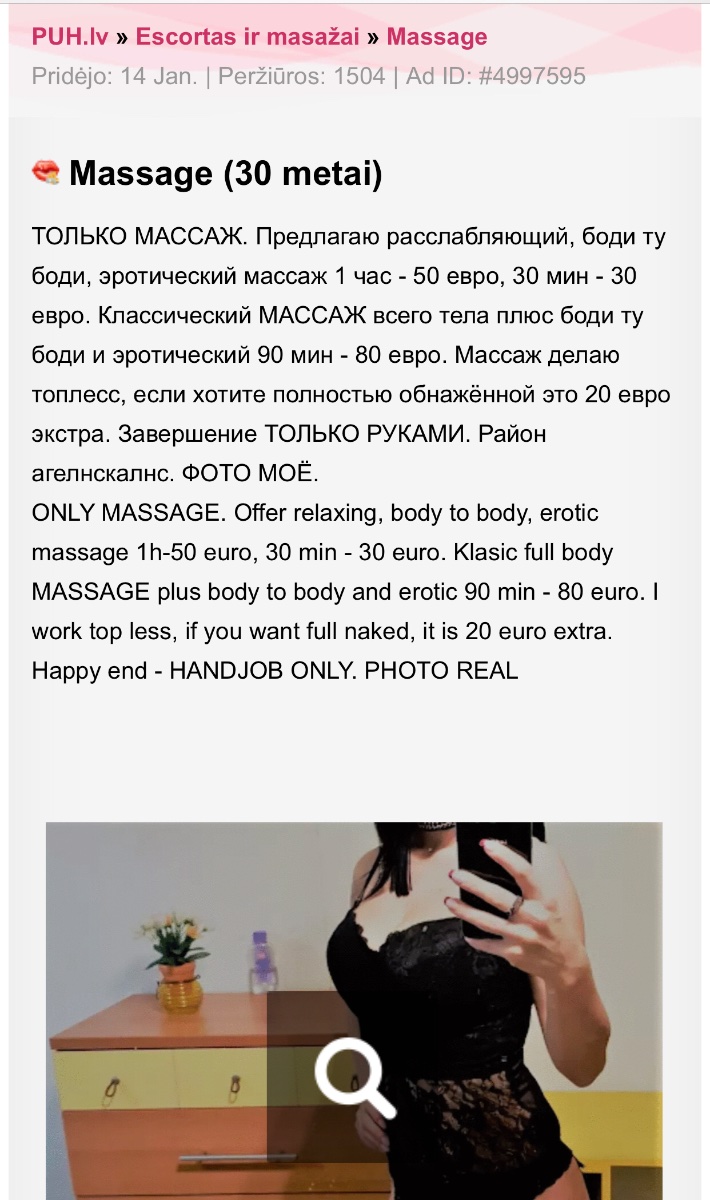 Sludinājumateksts - ТОЛЬКО МАССАЖ. Предлагаю расслабляющий, боди ту боди, эротический массаж 1 час - 50 евро, 30 мин - 30 евро. Классический МАССАЖ всего тела плюс боди ту боди и эротический 90 мин - 80 евро. Массаж делаю топлесс, если хотите полностью обнажённой это 20 евро экстра. Завершение ТОЛЬКО РУКАМИ. Район агелнскалнс. ФОТО МОЁ.