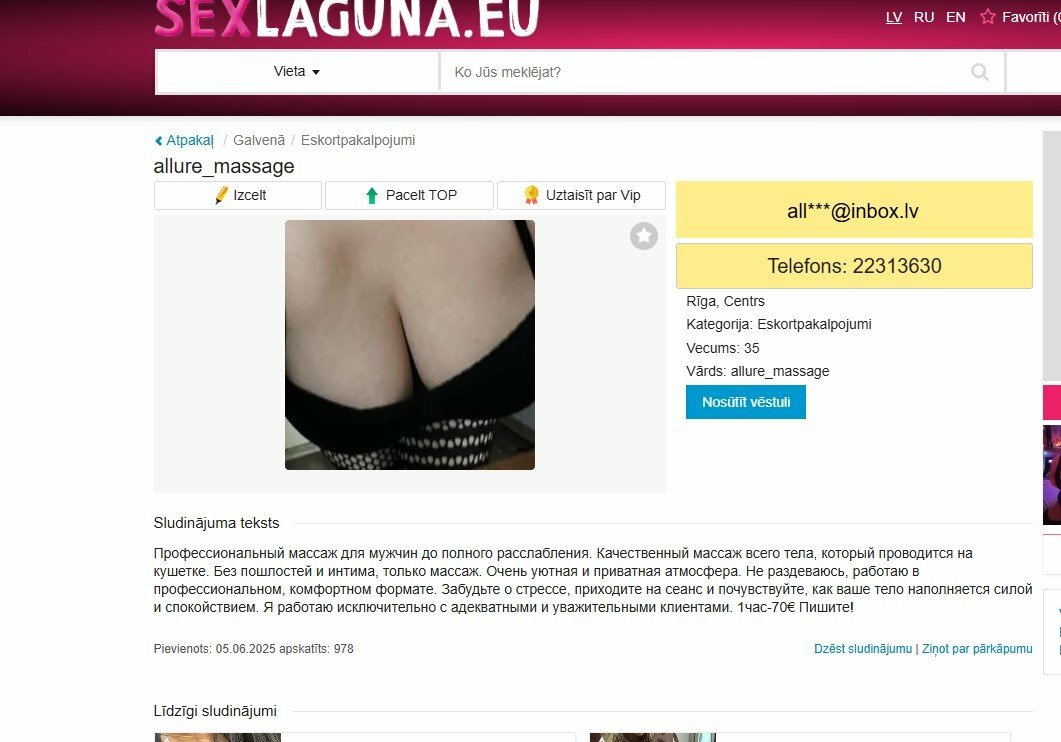 Veel viena masaazhiste, pareizaak sakot vinja ir divas, kas jau kaadu laiku sludinas kaa super masaazha bez sex utt, ka maksaa dorogo utml.Kadreiz arii nopikjoju par sho joku 30Ls (pzd:( tagad jau redzu ka to pashu dod pa 20Ls:))