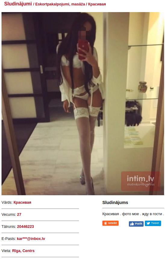 tratatata 12 Ierakstīts 2019. gada 29. janvāris Karina 26981068 [Intim.lv][Puh.lv] Ierakstīts 2019. gada 29. janvāris Vēl viens nr 20446223. Šī bilde iespārda karina.png Ja numurs tiešām viņas tad šķiet ka atgriezusies, un par masāžu pagaidām ne vārda:https://intim.lv/lv/adv/read/escort-massage/682509/1/index.html ------------------------------------------ Nu te lūk arī otrs sludinājums ar citu numuru jau priekš masāžas. Meitene sākusi pētīt mārketingu un tirgus pieprasījumu Link to post