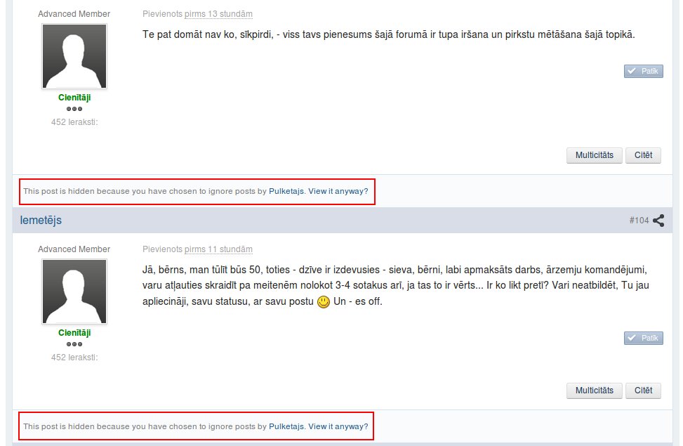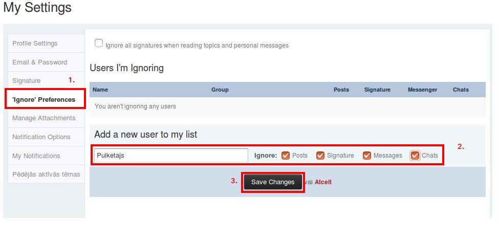 Kaut kā pēdējā laikā visādi lohi šeit uzrodas ar zināmu regularitāti (vai izglītības sistēmas vaina?). Tāpēc nolēmu izveidot nelielu pamācību, kā katrs priekš sevis var bloķēt nevēlamus lietotājus. Tā kā oriģinālā topikā man nav tiesību postot, ieliku to šeit.