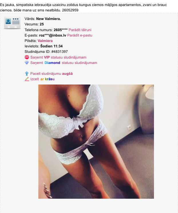 Kad pirmo reizi bija Valmierā biju pie viņas,,dzīvē vecāka kā bildēs,,runā latviski bet jūtams akcents.Pati teca ka no Liepājas vai tainības kas to zin...Dislokācija bija Rīgas iela..