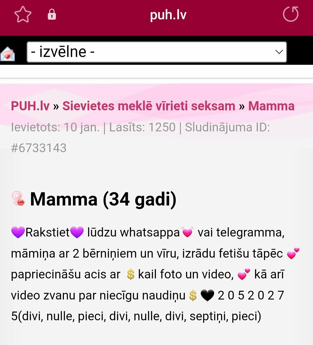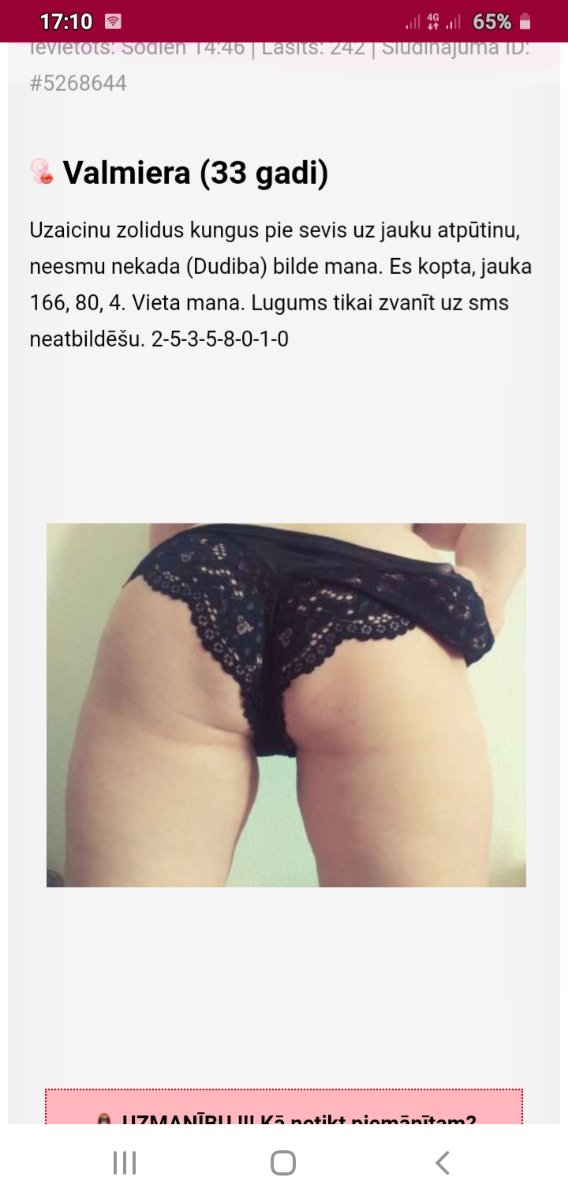 Nereklamešu neko.bet domaju neviens normals vecis nemaksas tai iedomigai matitei tadu ciparu ko viņa iedomajas,ka viņai zelta caurums,var dabut pa leeto citas,protams kuras nebrauka ar melnu bmw,bet vismaz satiekas par normalu samaksu.
