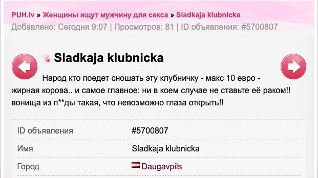 дай телефоны этих других.. в этом городе реально некого, до Релакса третий день дозвониться не могу, объявлений больше никаких нету, одна молодая была, фотку ещё попросила потом назвала 200 Евро, я просто о"уел, в Риге таких цен наверное нету.. ещё Ланта, но с той уже две недели не могу увидеться, всё завтра обещает...