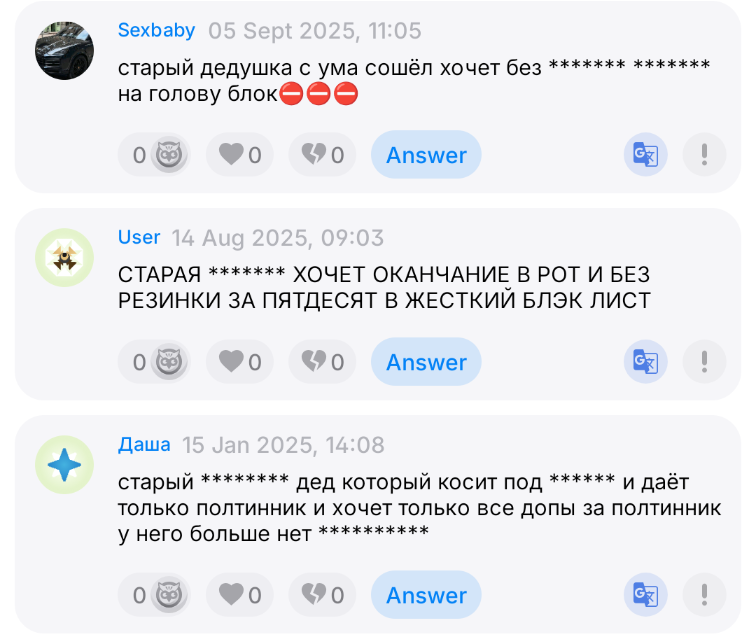 bet @Lauruxmalacis, ka vjna to dara . Varbūt kāds aizdomāsies , ka nevajag tādas lietas darīt ar sievietēm , un saglabāt savu labo klienta statusu Regulari es atsaku vīriešiem tikai tapec , ka par vinu ļoti sliktas atsauksmes. . Mēs, tāpat ka jūs, esam tikai cilvēki . Attieksme veido attieksmi .