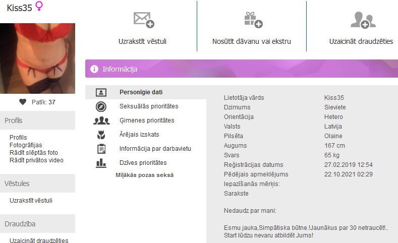 Informāciju deva sarakstē. Takse bija astoņi.nulle eur (laikam to nosaka pēc tā brīža pieprasījuma, jo agrākā sarakstē bija teikusi laikam četri.nulle) un divi.pieci par moteli. Foto atbilst. Vizuāli jauna sieviete ar dažiem ekstra kg, krunkām un krokām, krūtis patīkamas. Attieksme laipna un draudzīga. Vieta bija motelī pie Birzes ielas un Upes ielas krustojuma. Telpas ar visām minimālām ērtībām. Pirms dušas naudu atstāju telpā, pēc dušas uz gultas. Tālāk nedaudz maigošanās un mutiskais, kurā nedaudz sasmīdināja, jo skatījās sāņus, atgādinot kaķi, kas domā, ka tūlīt kāds atņems ēdienu. Pēc tam ar mēli jau sāka braukāt pa visu kājstarpi. Tālāk pamīšus dažādos leņķos misionārs un no aizmgures, kamēr varēja beigt. Procesā stenēja maz, bet patīkami, īpaši pie stiprākiem un dziļākiem grūdieniem.Opcijas: ja kopts, skūpstīšanās, rimings un viss bez gumijas. No ierašanās līdz promdošanās brīdim sanāca apm. 1h.
