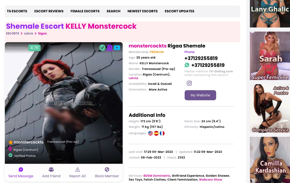 Очередная встреча с трансом,Келли очень активный доминирующий транс,член как и заявлено просто огромный,цены от 100 за пол часа,до 250 если на час и полный спектр услуг включающий жесткую доминацию,либо переодевание в девочку и вас используют как эскорт девушку по полной программе.