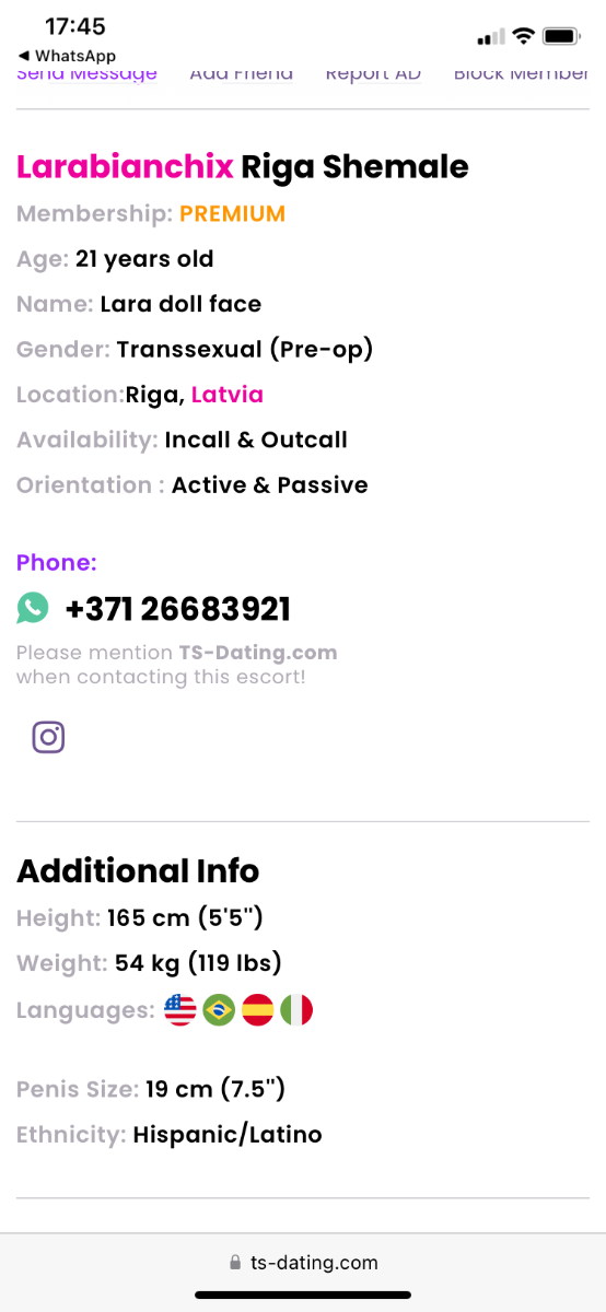 Foruma ir ļoti maz informācijas par TS, un šī būtnei nav atsauksmes , tāpēc nolemu uzrakstit .Tie, kuriem patīk eksotika, droši ejiet- bildes 100%,man pat likas , ka dabā izskatās smalkāka . Vina tiešām ir skaista TS lellīte 😊Stastija, ka LV ir otro reizi un vēl būs nedēļu .