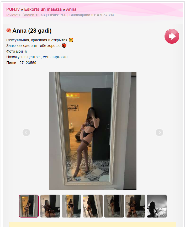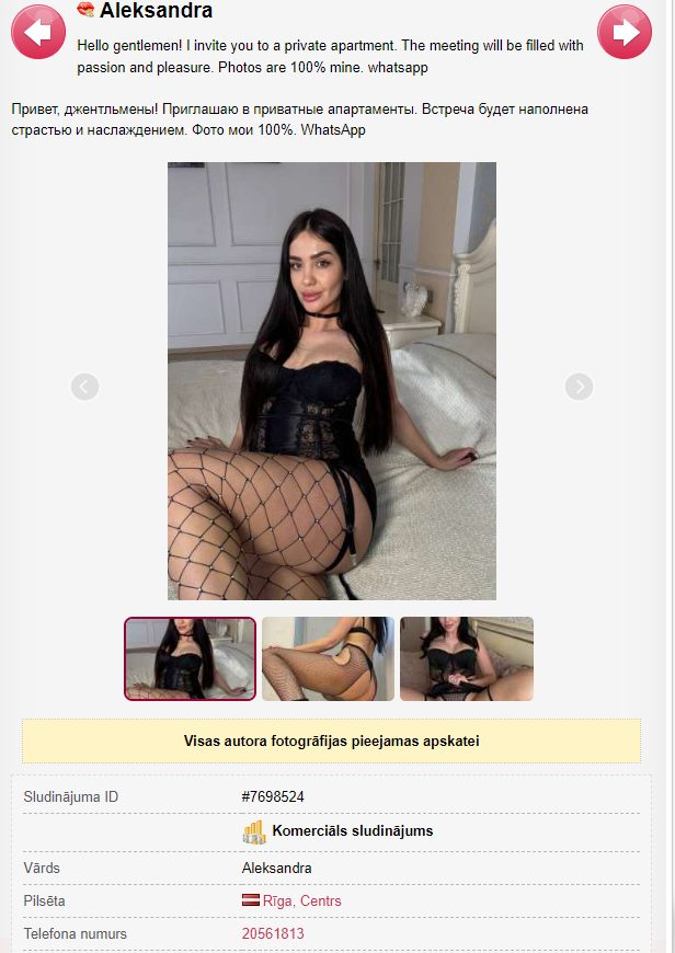 Atrodas Vecrīgā, durvis atvēra maza auguma slaida meitene, vecums atbilst un bildes ir viņas, bet seja dzīvē izskatās nedaudz citādāk, nu tā ne pārāk. Pēc sejas kā saka na ļubiteļa lai skanētu pieklājīgi, bet augums viscaur patīkami stingrs, kas man ļoti patika, uztur sevi formā. Krūtis varētu būt 2 izmērs, mazas bet tvirtas, un pats labākais viņai ir dupsis, ne par lielu ne par mazu priekš viņas auguma un ļoti tvirts. Tas pats attiecas par vāveri, nobraukuma pazīmju nav, viss ciešs un gluds. Sākumā noguldīju viņu gultā, papriecājos par augumu, apgriezu uz vēdera un paspaidīju apaļumus, kamēr uzvilkos.