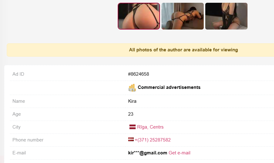 Bildes nav īstas - vai vēl kaut ko nepieciešams komentēt. Strādā uz Alfrēda Kalniņa ielas, dzīvoklis foršs ar plašu dušas telpu. Dvieli iedeva sausu, bet turpat vannas istabā mētājās čupa ar mitriem. Dāma ar citu formu nekā bildēs. Vēders nokarājas un redzamas dzemdēšanas pēdas. Toties krūtis lielas un dabīgas. Seja arī ne visai.