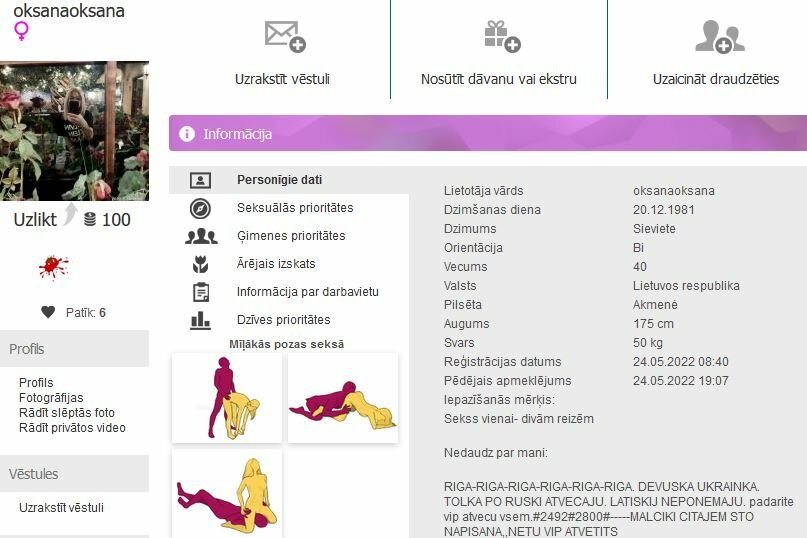 Takse desmit.O (pēc xtra cenzūrām viens zaļais) eur, par 0,5h astoņi.O jeb četri zilie, ko arī izvēlējos. Prot arī nedaudz angliski. Foto atbilst, bet varētu būt paveci vai arī digitāli apstrādāti. Uzreiz pat neatpazinu, mati nedaudz tumšāki un pēc vaibstiem nedaudz atgādināja mulati. Vizuāli pusmūža sieviete ar labām formām, krūtis palielas un patīkamas. Attieksme laipna, bet iespējams, ka pārāk ātri ierados, jo neparasti, ka sagaidīja parastās velūra treniņbiksēs un uz kājām ar tausti vēl nedaudz manāms ataugušais apmatojums. Vieta netālu no Artilērijas ielas un Kr.Barona ielas krustojuma. Moderns un neliels īres dzīvoklis ar visām minimālām ērtībām. Pēc dušas uz gultas. Nedaudz pamīlinājāmies, novilka apakšveļu un tālāk uzreiz virsū gumija, uzsākot darboties misionārā. Vēlāk dažādos leņķos no aizmugures. Procesā stenēja daļēji samāksloti, kustības gandrīz kūtras un formālas. Pēc apm. 30min mudināja beigt, jo bija pagājis laiks. No ierašanās līdz prom došanās brīdim apm.40min.