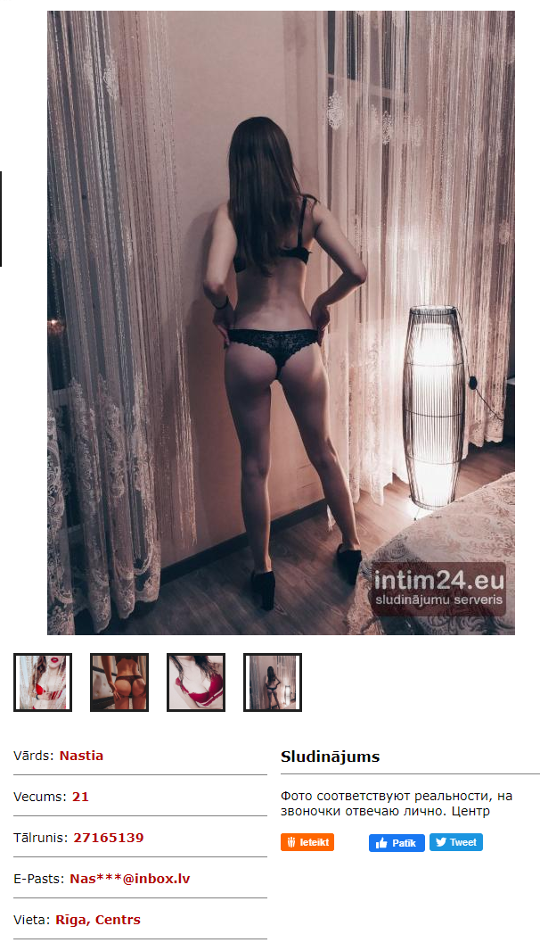 Nastia reklamējās, ka pati menedžē telefonu un pēc ilgākas sarunas Whatsapp tā arī varēja noprast. Pieņem Brīvības 148, kas tiešām ir kaut kāds vairāku dzīvokļu bloks, kur noteikti ir arī citas dāmas vai pat viņu menedžeri. Meitene tiešām bija tieši tāda, kāda redzama bildēs. Bet ar to arī lielā sajūsma pa lielam arī beidzās, jo bija labi redzams, ka meitenei šī pilsēta un nodarbe te jau ir pieriebusies līdz kaklam un nekādas dižās atdeves darbā arī nebija. Metu krānu pie malas un vienkārši aprunājos. Viņa ir no Ukrainas un principā visu laiku nākas būt dzīvoklī un strādāt. Kad uzprasīju vai kaut ko ir paspējusi redzēt pilsētā, teica, ka principā laukā nav bijusi. Vēl viena interesanta lieta bija tas, ka kāds bija pamatīgus zilumus uz kājas atstājis un pati pie gultas pa tvērienam turēja piparu/asaru gāzes baloniņu. Kaut ko tādu pieredzu pirmo reizi. Plus, dodoties prom viņa pavadīja ar visu baloniņu rokā. Kaut kas meitenei te pie mums nav sagājis.