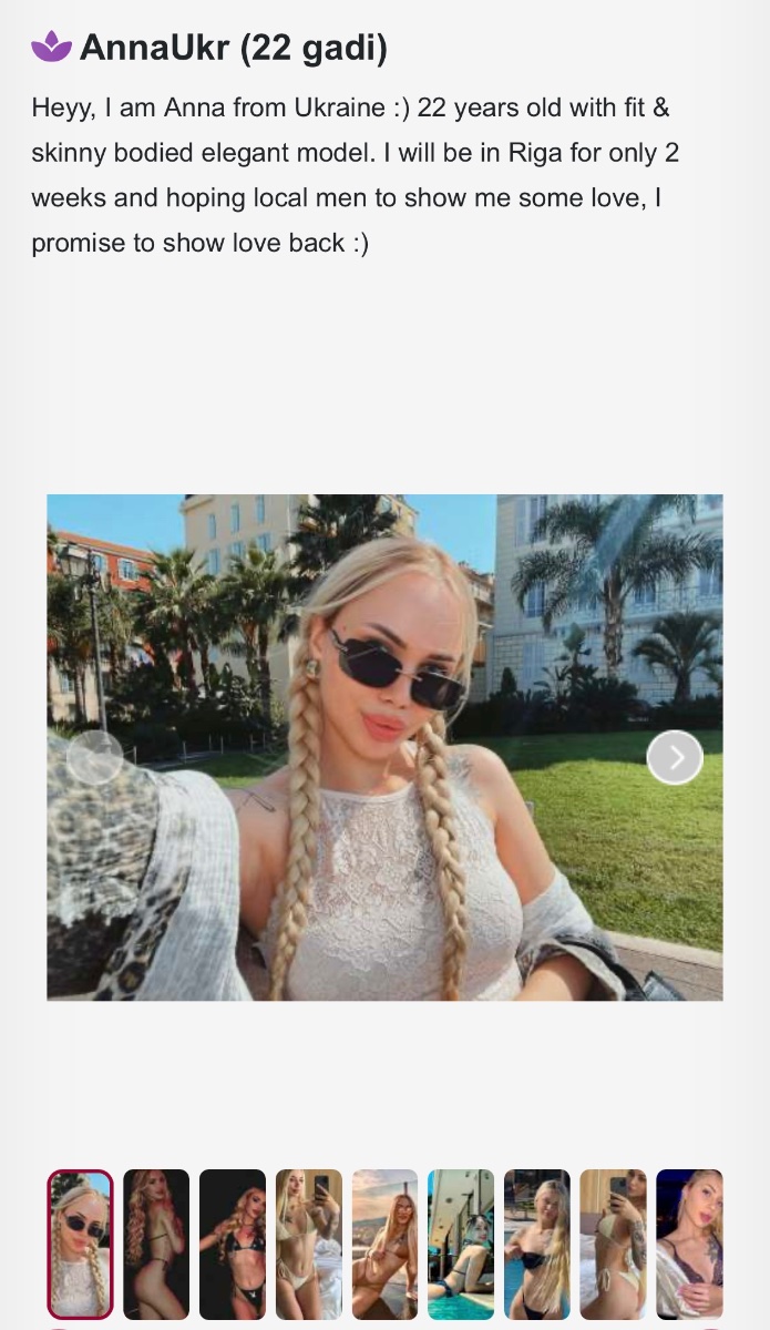 Heyy, I am Anna from Ukraine 22 years old with fit & skinny bodied elegant model. I will be in Riga for only 2 weeks and hoping local men to show me some love, I promise to show love back