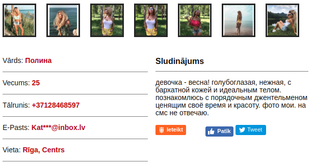 Biju aizbraucis, Vagonu 22, meitenei bildes nav nekada sakara ar to kas Jus sagaidis tur. Si meitene vismaz ir 3 reizi RIga, katru reizi zem cita numura un bildem. Lielakais botoksa upuris ko reali dzive esmu redzejis, pa visu seju sabazts un nekvalativi tas viss izskatas , skkibs un uzputies. Krutis ar silikona, bet skibas un lielam operacijas retam.
