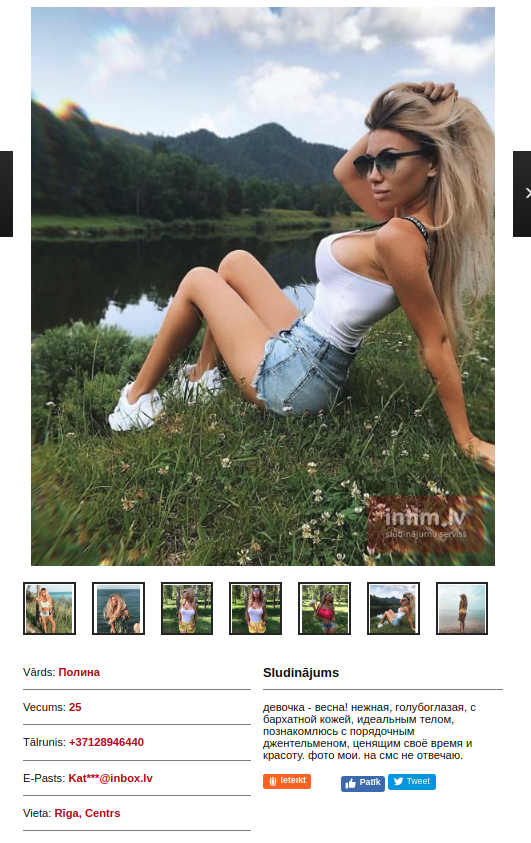 Kungi! Visas bildes ir aptuvenas! Sistēma ir tāda kad zvani un sazvani koordinātori kura tev piedāvā izvēlēties kuru meiteni tu vēlies. Pēctam tev nosūta adresi,bet tad kad ierodies ar sms atsūta tev apakšējo durvju kodu un dzīvokļa nr. Esmu bijis pie Milena (Ernesta Birznieka-Upīša 18b) bildes nav viņas,bet +- vienādas! Angelina (intim.lv) atrodas Elizabetes ielā 8. Melanie atrodas vecrīgā Pils ielā 8,lūk tieši šo darboni neiesaku, jo no visām ir pati vecākā ar nošļukušām krūtīm(lielā) lieko krunku uz punča, un izkačātu dupsi! Pirmās divas ir vēl +- OK tad Pils ielas darboni NOTEIKTI NEIESAKU!!! Pirmais priekštats ir mānīgs jo sagaida halātā zem kura grūti noprast sievišķīgās aprises! Visas piedāva minetu gan ar vai bez gumijas! Naudiņa protams pa priekšu visas ņem. Visās standarta cena primajām divām dāmām 170e=1h(30min 120e),bet vecrīgas darbonei 160e=1h,bet 30min 100e! Process kā visām viesmāksliniecēm vienāds...smuki laipni(viltīgi) sagaida(čivina),procesā biku samāksloti pakunkst .u.t.t. viss kā parasti un visur +- līdzīgās vietās par līdzīgu summu! Cena biku par augstu visām pieņemami būtu 1h=100,bet 30min+70e tad nebūtu ok! KKĀ TĀ kungi! tik nekritizēja ka nav bilžu u.t.t. nav tam laika un nemāku )