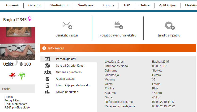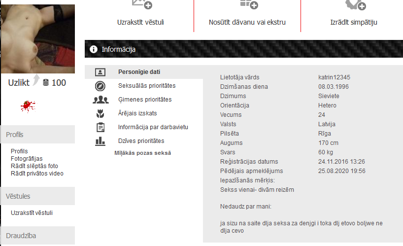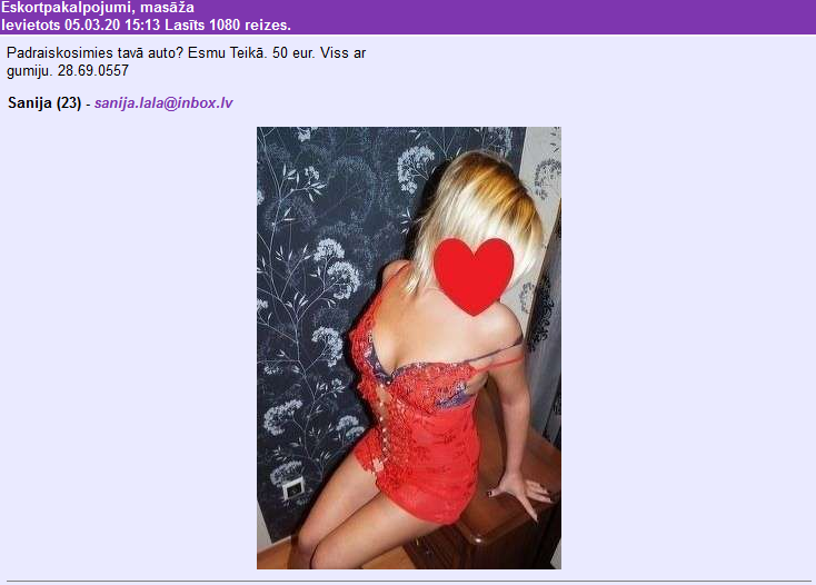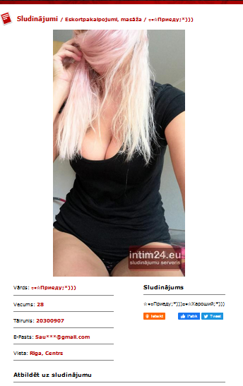 laiminieks 27 Ierakstīts 2020. gada 26. augusts Katrin12345 no go4sex.eu Ierakstīts 2020. gada 26. augusts Vai ir kāda atsauksme par šo? Sludinās go4sex.eu (4sex.lv) par minetu prasa 30 EUR. Pagaidām vairs nav atbildējusi. Link to post