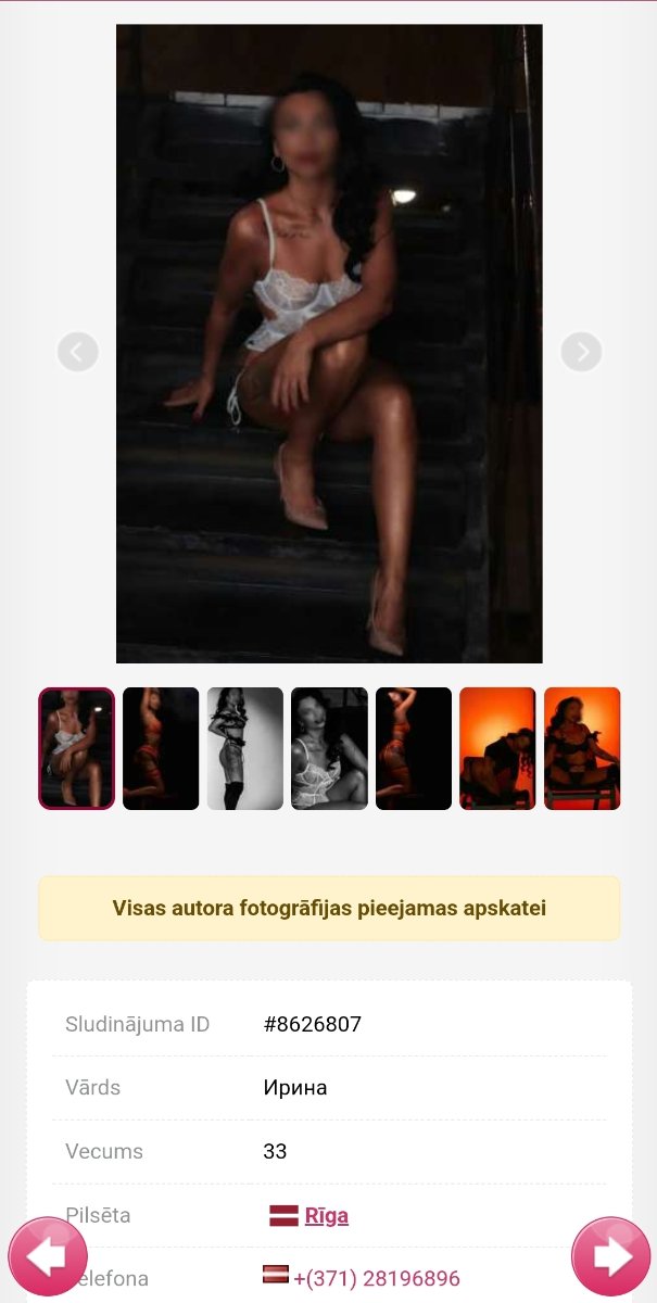 Sanāca apmeklēt. Ka jau bija rakstīts bildes +/- atbilst. Meitene ir apaligāka neka foto, bet viņa godigi raksta ka svars 70kg, ta ka baigais parsteigums nebiju, īpaši ņemot verā ka gaju paspaidīt krutis, un to arī dabūju. Lielas dabīgas, diezgan stingras, krutis, un patikams parsteigums - pirsings krušgalos. Seksa diezgan aktīva, īpaši patīka ka esot augša, pati maina leņķus un voena mementa krutis iebaza tieši sejā