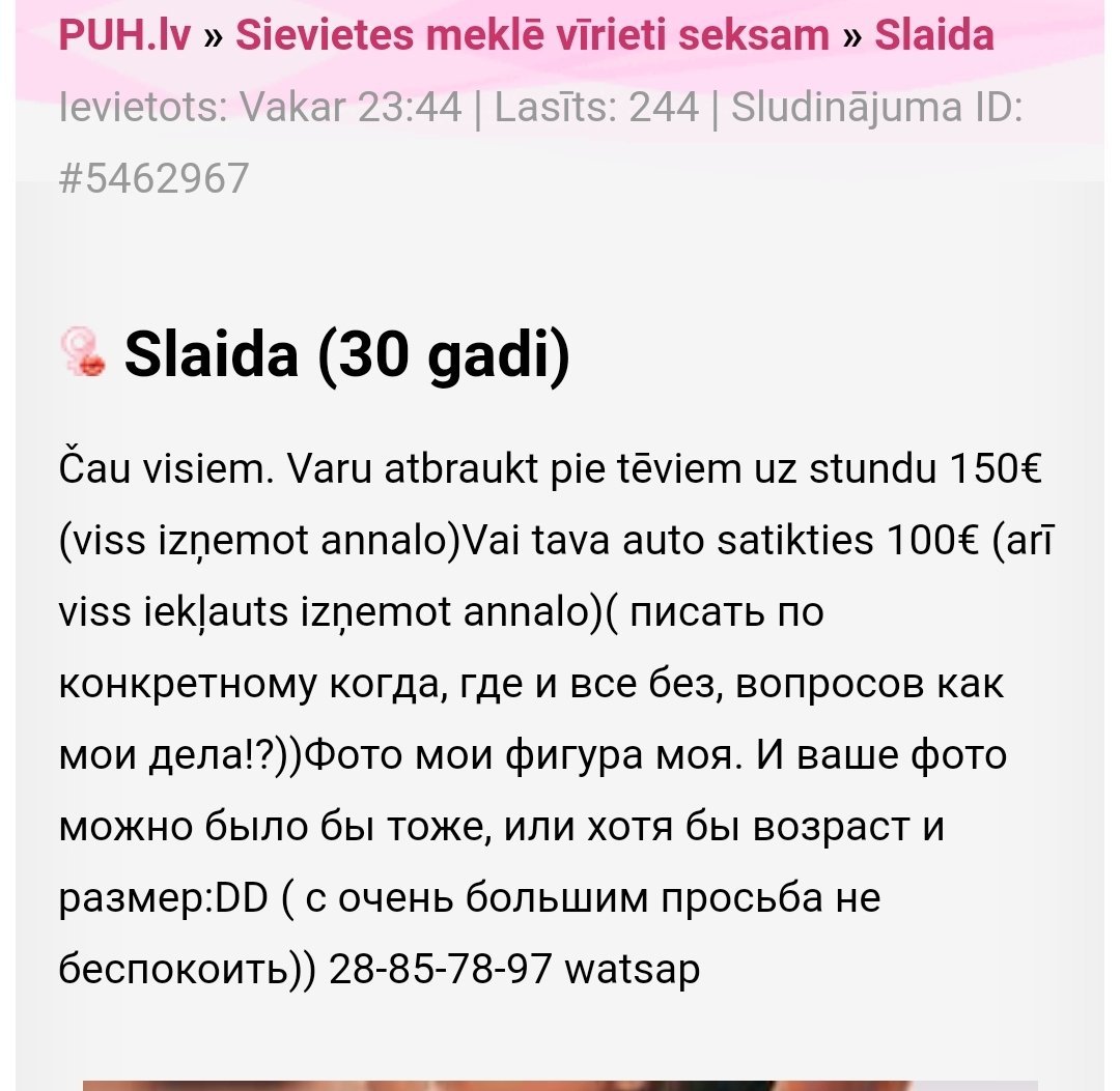 Čau visiem. Varu atbraukt pie tēviem uz stundu 150€ (viss izņemot annalo)Vai tava auto satikties 100€ (arī viss iekļauts izņemot annalo)( писать по конкретному когда, где и все без, вопросов как мои дела!?))Фото мои фигура моя. И ваше фото можно было бы тоже, или хотя бы возраст и размер:DD ( с очень большим просьба не беспокоить)) 28-85-78-97 watsap