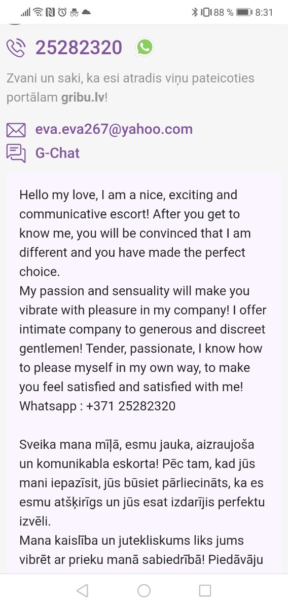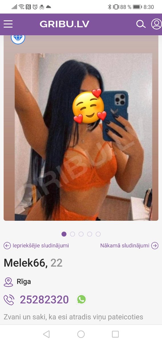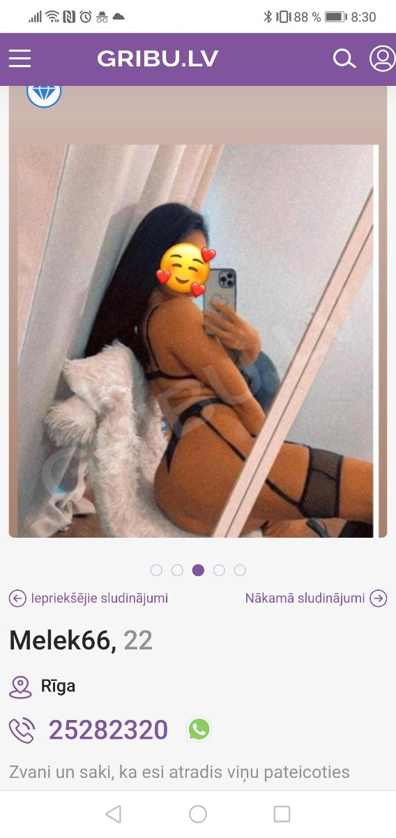 Šī ir kārtējā latina, bet esmu ievērojis, ka diezgan bieži brauc pie mums uz "tūrēm". Bildes fake, protams, bet sarakstē atsūta īstās - meitene ar dimanta tetuvejumu uz kakla. Bieži maina numurus un profilus.