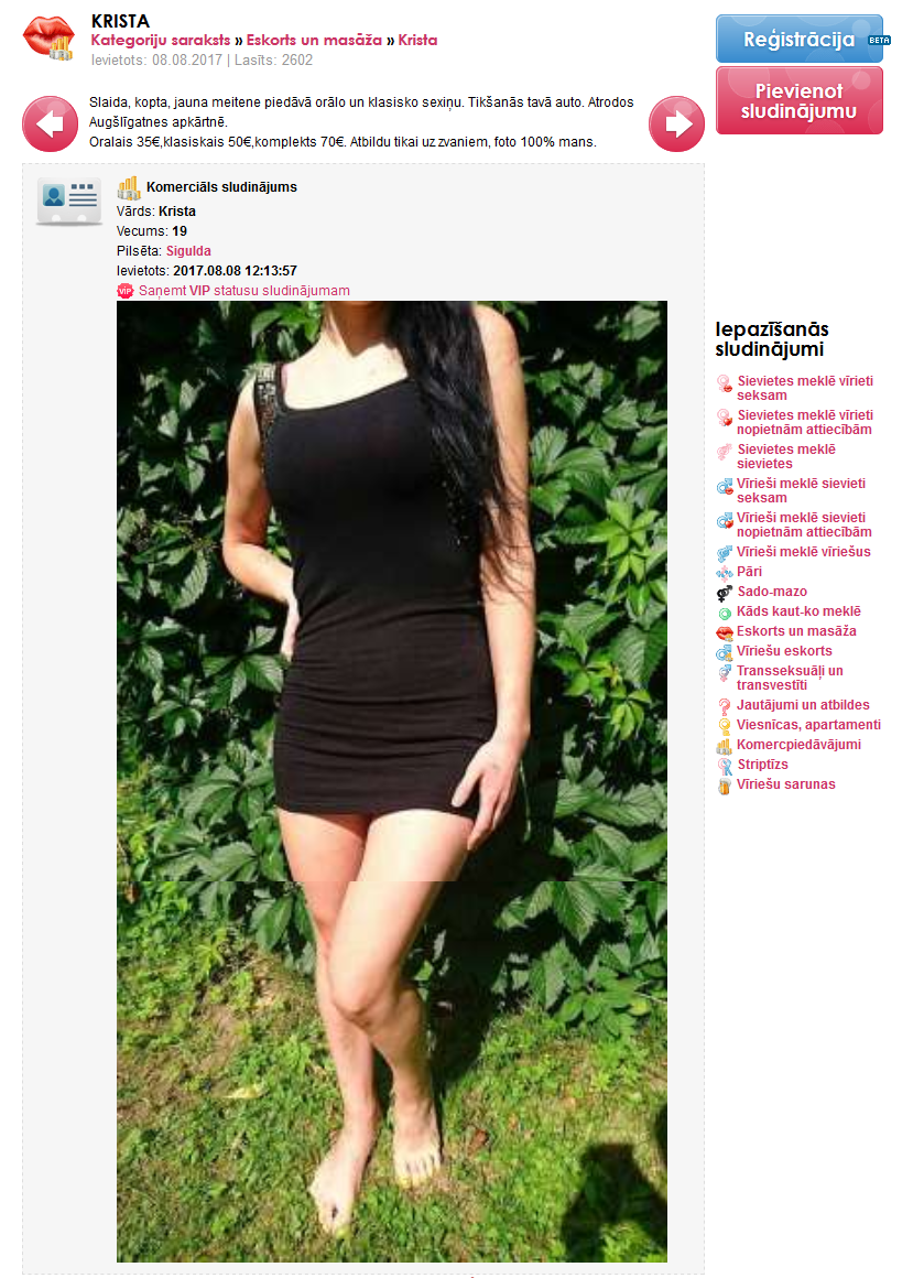 Sludinājuma teksts no puh.lv: Slaida, kopta, jauna meitene piedāvā orālo un klasisko sexiņu. Tikšanās tavā auto. Atrodos Augšlīgatnes apkārtnē. Oralais 35€,klasiskais 50€,komplekts 70€. Atbildu tikai uz zvaniem, foto 100% mans.