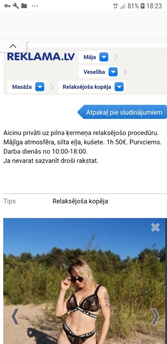 Sveiciens.Varbūt kādam ir kāda pieredze ar šo dāmu?Sludinās jau kādu laiku ,sazvanīju tajā dienā bija aizņemta man vēlamā laikā. Sakot ka vairāk klasikas masāža. Pa 50 eir bik pa šerpu priekš klasiskās masāžas,jeb būs paturējusi ko personiskāku intrigai uz vietas?Ir kāds apciemojis Lindu ,pāris vārdos labrāt dzirdētu ir vērts to 50eir masāža?Paldies!