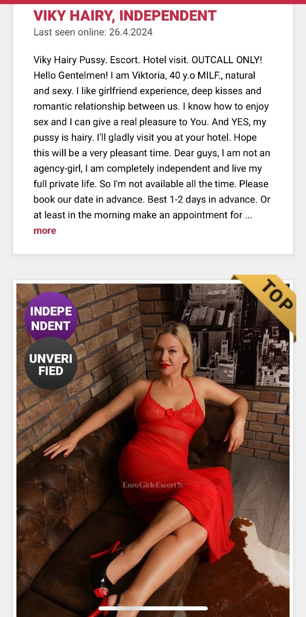 Sludinājums no Euroescort ( https://www.eurogirlsescort.com/escort/viky-hairy/296009/?list=45ids )