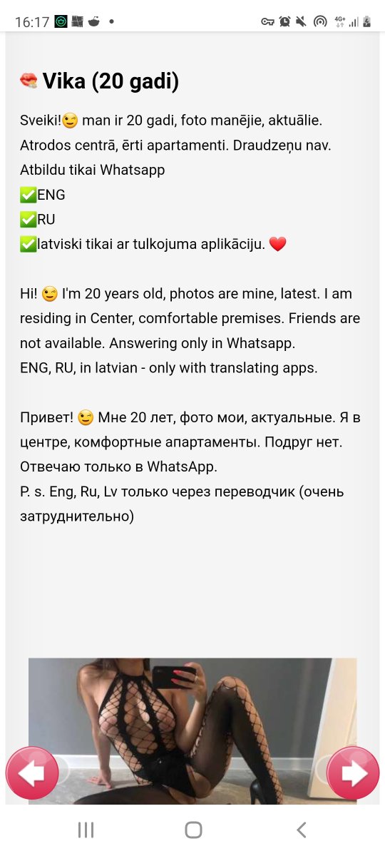 Kad gribēju satikt jau biju mēğinājis apmeklēt vienu Ukraiņu daiļavu. Foto nu vai nu no mağiskiem leņķiem, bet visticamāk fake. Marijas ielā. Kā atvēru durvis sapratu, ka varbūt meitene jauna, bet galīgi nav manā gaumē un nekam līdzīga kā bildēs. Tad rakstīju Kiras jaunkundzei, bet piekodināju, lai atsūta aktuālās bildes, atsūtīja ,bet ne tās kas sludinājumā. "Nē paldies" no manis. Bet žēl ka tā māna klientus. Noteikti operātori. Pašas meitenes vismaz manis satiktā Eng vispār nemācēja, kas, man ir mega mīnuss.