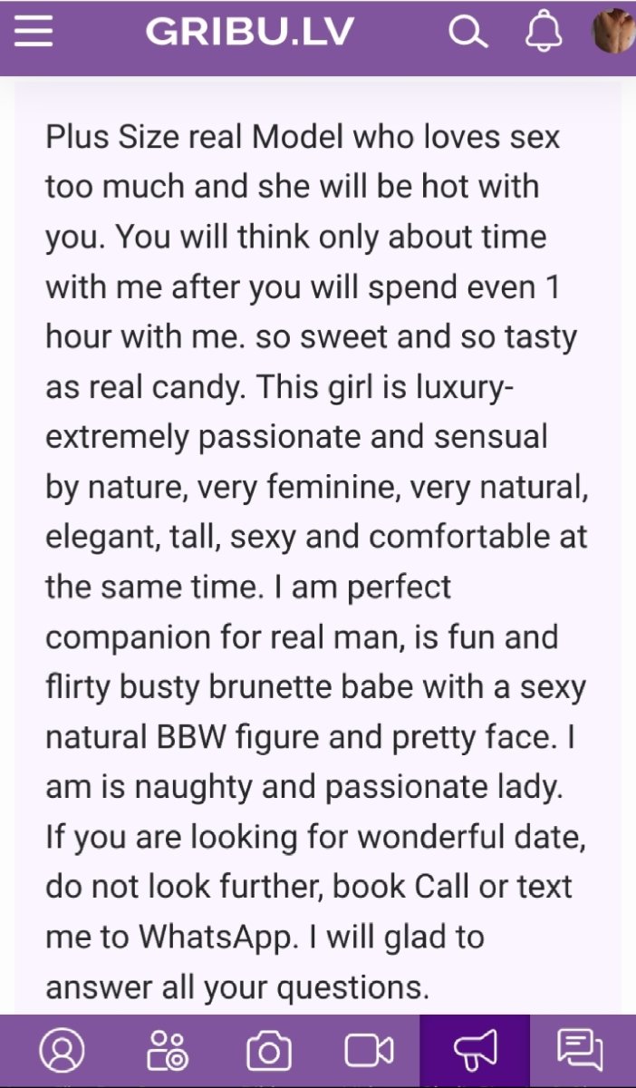 Plus Size real Model who loves sex too much and she will be hot with you. You will think only about time with me after you will spend even 1 hour with me. so sweet and so tasty as real candy. This girl is luxury-extremely passionate and sensual by nature, very feminine, very natural, elegant, tall, sexy and comfortable at the same time. I am perfect companion for real man, is fun and flirty busty brunette babe with a sexy natural BBW figure and pretty face. I am is naughty and passionate lady. If you are looking for wonderful date, do not look further, book Call or textme to WhatsApp. I will glad to answer all your questions.
