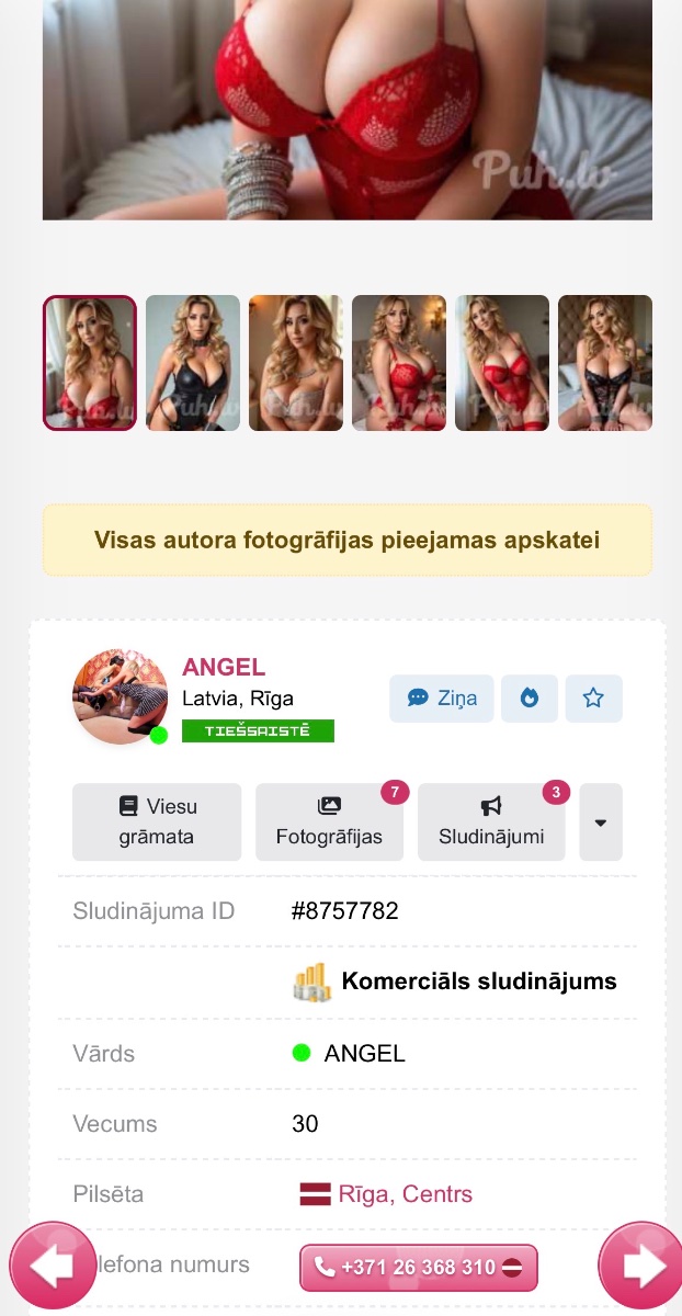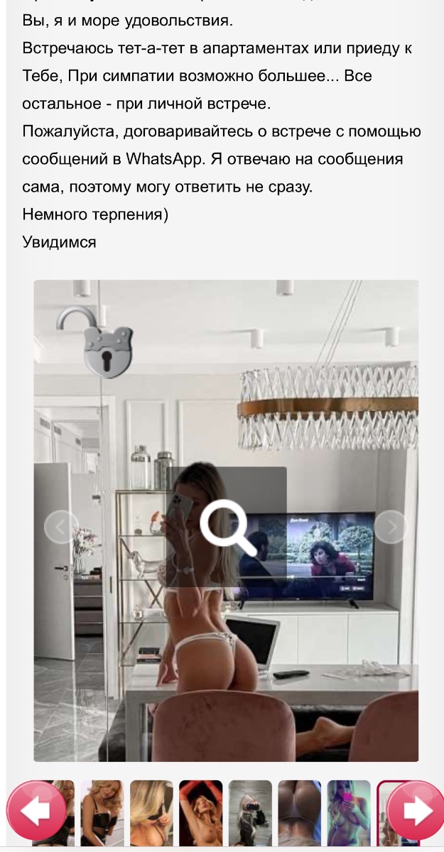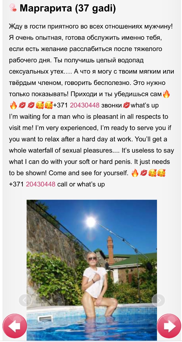 prasīja avansu, bet beigas vienojamies, ka atbrauks pie manis uz viesnīcu. Teica, naudu uzreiz pēc atbraukšanas. Izklausijās dīvaini. Pēc tam uzrakstīja, ka varu braukt pie viņas bez avansa. Ok… nu bet kad atbrauksi tad tevi ielaidīs sievieta un iedot viņai 60 eur, tā būs saļa no summas 😂 sapratu, ka bezjedzīgi runāt. Tad atkal uzrakstīja, ka aybrauks uz viesnīcu pēc 18:00…. Vienīgais nenosauca dienu vai datumu… 😂 nerakstiet. Aaa… vēl ļoti prasīja selfi… atsūtīju bez sejas - nederēja. Obligāti vajadēja seju. Nesūtiet. Man paziņa aizsūtīja in kaut kādā veidā viņa foto bija internetā par izvarošanu un prasīja 1000 eur… protams pasūtīja dirst, bet noteikti ir kas uzķerās