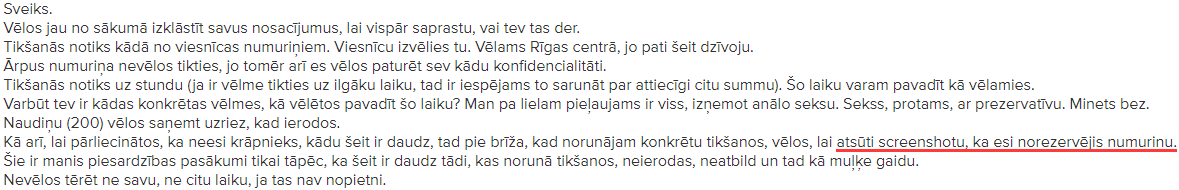 Взял на час, за 160 евро. Ехал на Brivibas 90. Встретила в красном белье, как на фото, и на каблуках. Фото полностью совпадает, фотошопа там минимум. Познакомились, отправила в душ, дала 3 полотенца. Я доплатил за МБР с окончанием в рот 50 евро. После душа предложила выбор места действия, а квартира большая, там и кровать, и диван, и даже на столе кухни думаю, она бы согласилась. В МБР она мне отказала, но я не в обиде, деньги вернула.
