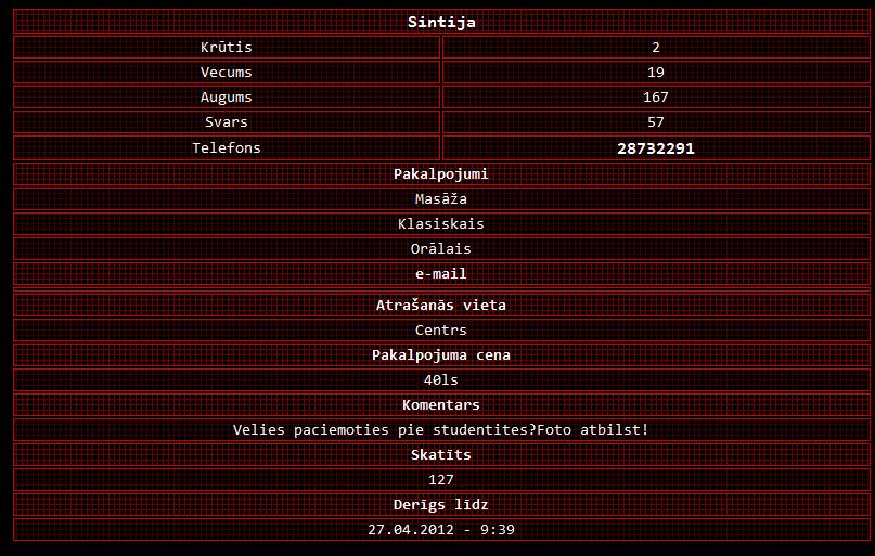 Bet tagad parasti esmu agenskalna/spices rajona, varbut kads var padalities ar "top class" kontaktiem ja tadi ir shaja puse? Interese jaunas, slaidas, cena nav problema. Kadreiz zinaju 10/10 super skaistu meiteni no panorama plazas, bet nu jau kadu laiku nenodarbojas..