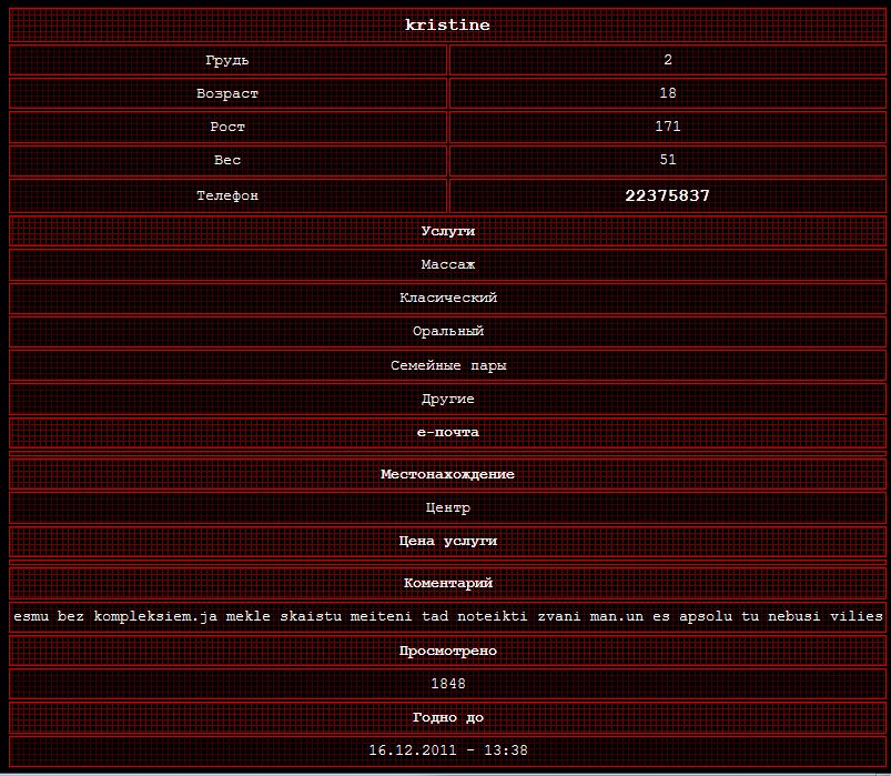 Ищу действительно красивую, молодую, ухоженную девку! Не дешевую, ограничений по цене нет. Кто знает, такие есть в Риге? Прошу всех кто может подсказать, отпишите пожалуйста! Киньте ссылочку на таких девочек, с реальными фотками.