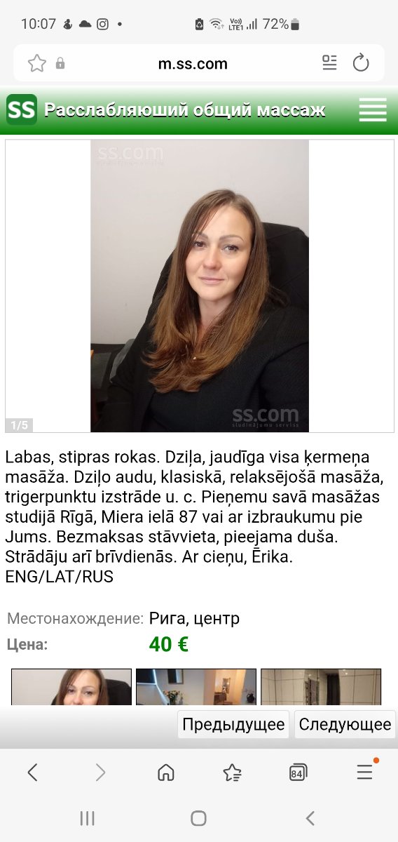 Labas, stipras rokas. Dziļa, jaudīga visa ķermeņa masāža. Dziļo audu, klasiskā, relaksējošā masāža, trigerpunktu izstrāde u. c. Pieņemu savā masāžas studijā Rīgā, Miera ielā 87 vai ar izbraukumu pie Jums. Bezmaksas stāvvieta, pieejama duša. Strādāju arī brīvdienās. Ar cieņu, Ērika. ENG/LAT/RUS